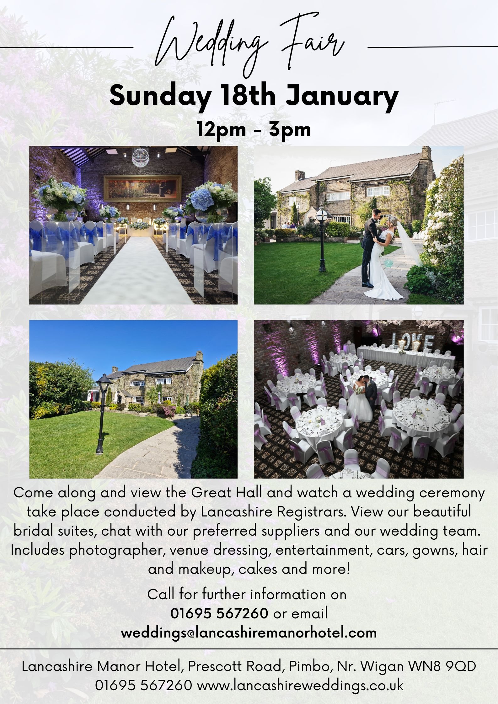 Wedding Viewing Night Come along and view the Great Hall dressed for a Christmas Wedding Thursday 4th December 6pm -8pm or call us to arrange an appointment to view the Great Hall and discuss your wedding plans on a date that suits you. Evenings and Weekends available Call 01695 567260 for further information or email weddings@lancashiremanorhotel.com |