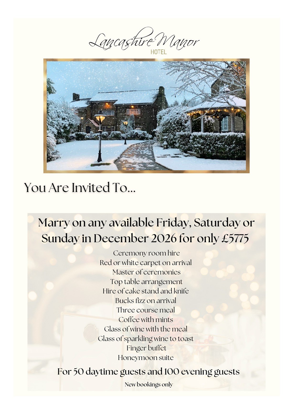 Wedding Fair Sunday 19th April 2026 Come along and view the Great Hall, view bedrooms and chat to our recommended suppliers and Wedding team. Bridal Fashion show by Trudy Smith Bridal Boutique Sunday 19th April 2026 12pm - 3pm or call us to arrange an appointment to view the Great Hall and discuss your wedding plans on a date that suits you. Evenings and Weekends available Call 01695 567260 for further information or email weddings@lancashiremanorhotel.com |